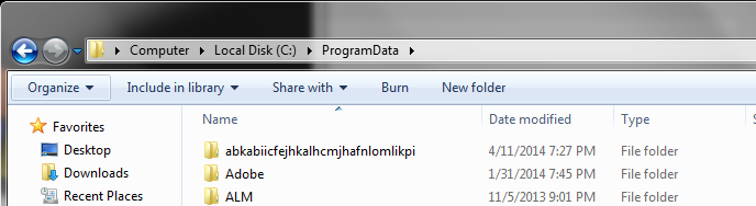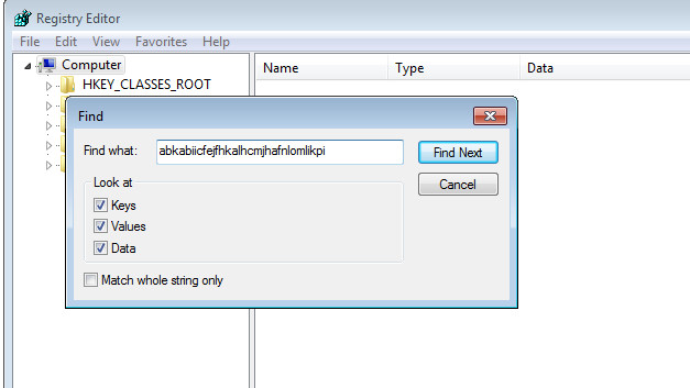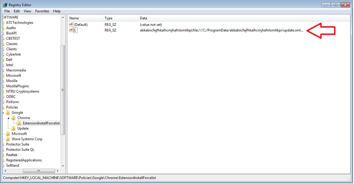 • Vemos la ruta donde esta instalado este ya que debemos eliminar la carpeta manualmente, en este caso es en C:/ProgramData/abkabiicfejhkalhcmjhafnlomlikpi, después de ver la direccion borramos esta llave de registro.2014-04-11_151723